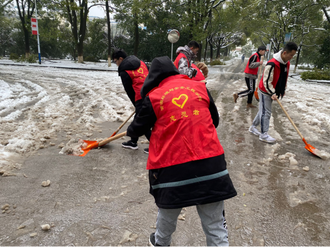 大家躬着身子,拿起铁锹、扫帚等工具,自主组建扫雪队伍,全力清除档案馆,第四教学楼和俱乐部周边人行道路上的积雪和暗冰。大家不畏严寒,积极配合、齐心协力,挥舞着铁锹和笤帚,你铲我扫,一派热火朝天的景象,一点点地将积雪和冰层铲起集中堆放。一个个忙碌的身影在皑皑白雪中构成了靓丽的风景线,路过的老师同学们都对志愿者们忙碌的身影投来赞许的目光,为这支扫雪大军“点赞”。