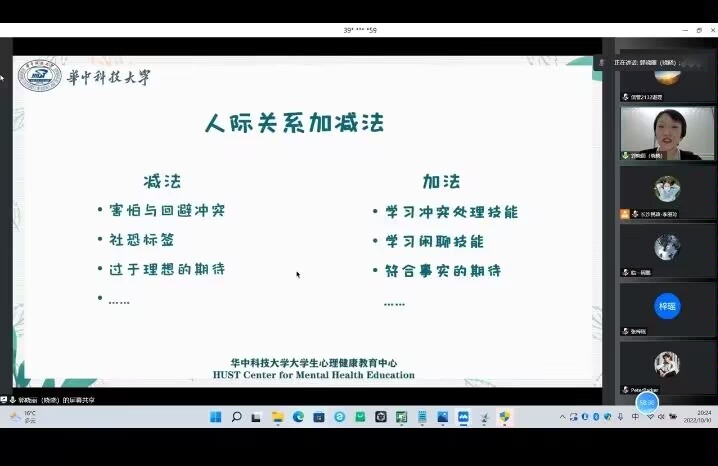 为了帮助大学新生加强心理健康意识,增强心理调控能力,培育积极向上的健康心态,糖心视频 于10月10日开展了主题为“大学新生心理适应”的线上心理健康知识讲座。长沙民政学生工作部心理指导主任杜莹老师主持该讲座,华中科技大学心理健康教育中心郭晓丽老师主讲。