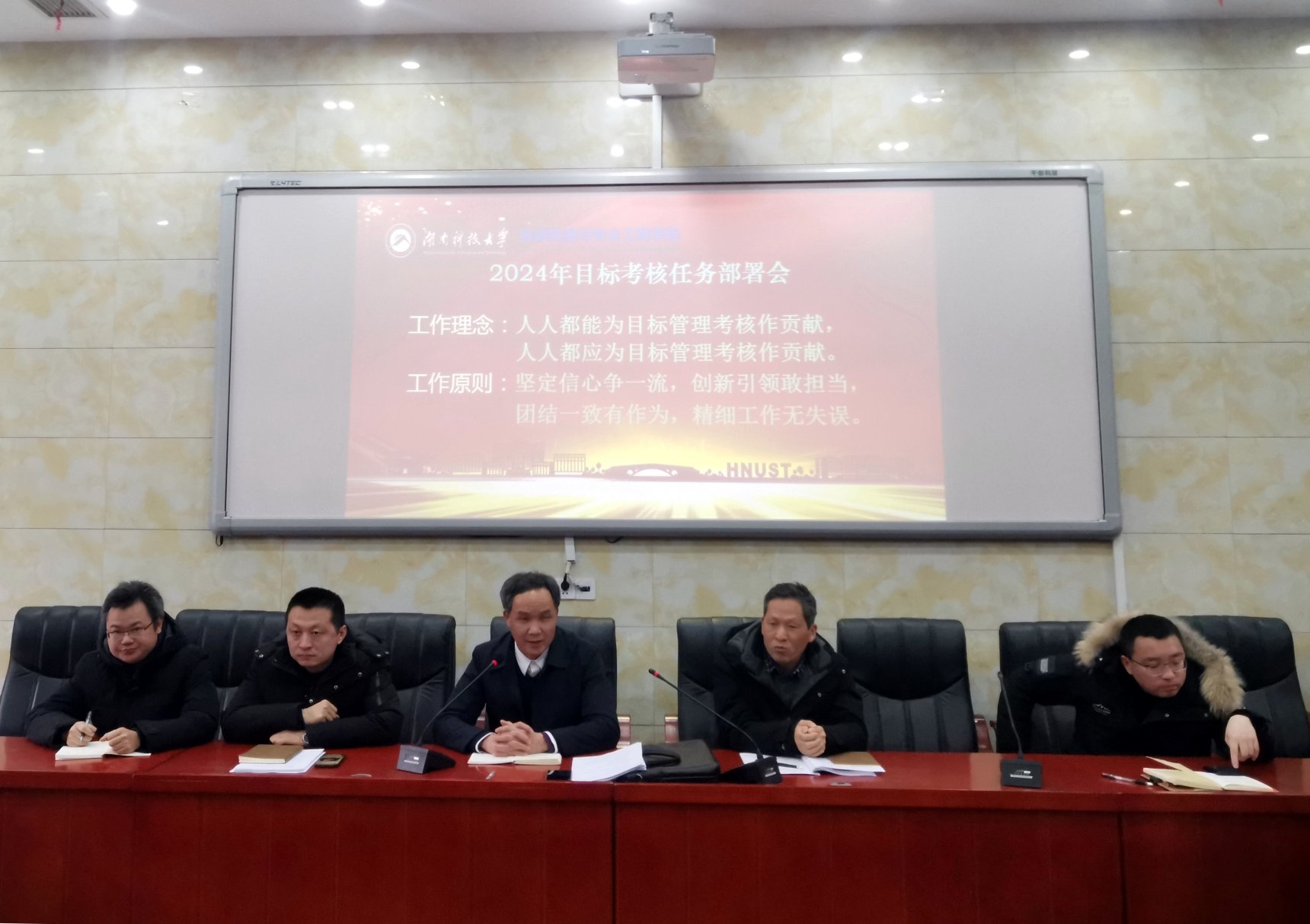 会上,进行了2024年目标管理考核任务领受。各系主任代表本系教职工领受目标管理考核任务。
