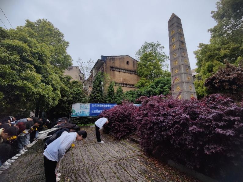 首先,谭翀老师简单介绍了位于湘潭文庙奎星门前的抗日阵亡将士纪念碑的由来和历史。随后,学生代表敬献花篮、整理缎带,全体默哀一分钟;同学们向纪念碑三鞠躬并缓步绕行瞻仰纪念碑一周,将手捧的菊花轻轻放在纪念碑底座四周,向抗日阵亡将士表达崇高的敬意和深深的思念。