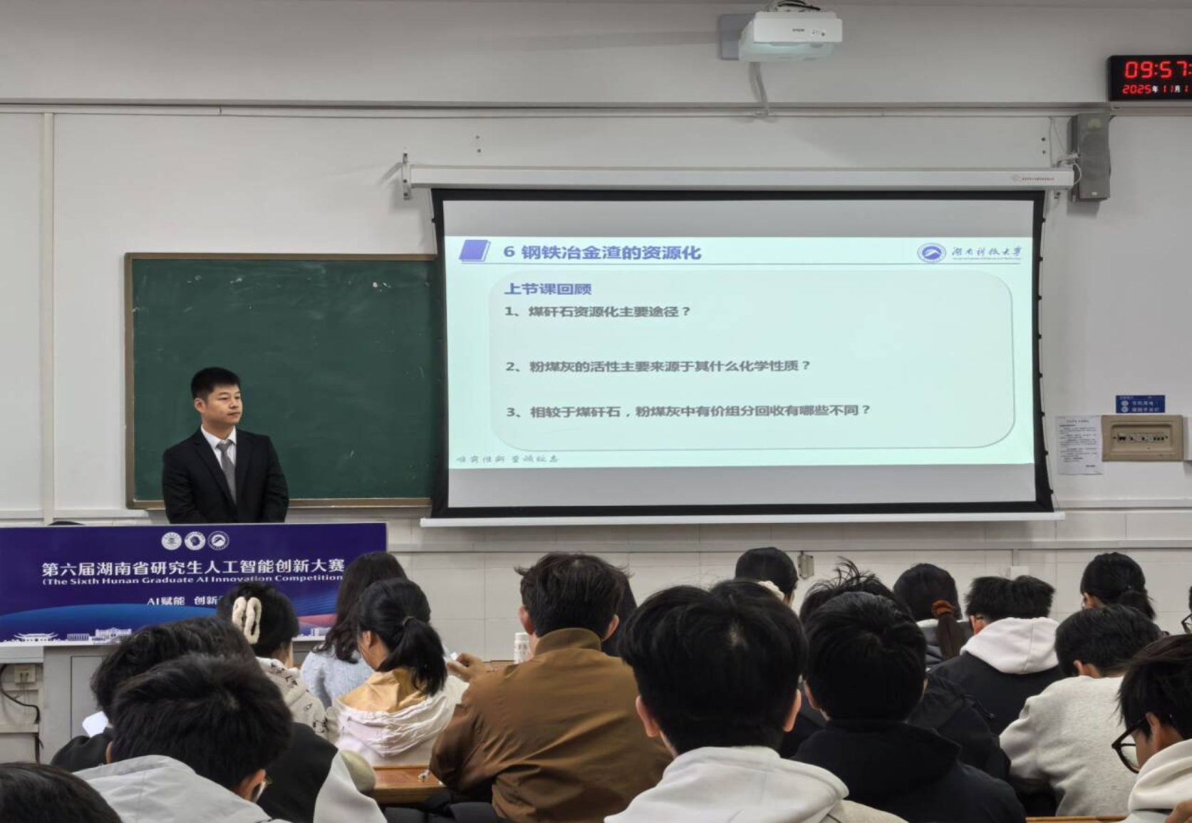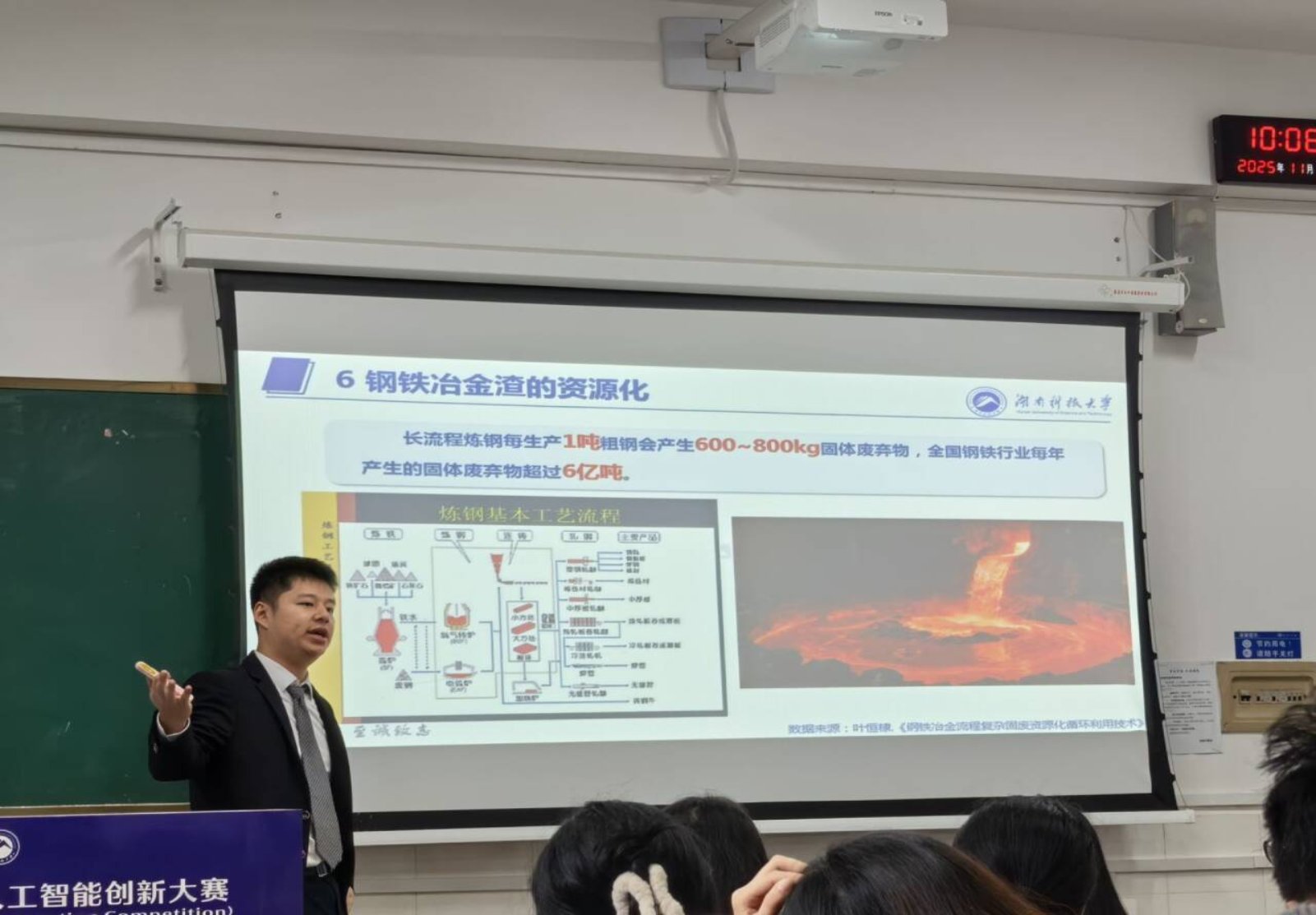 课堂上,易晨星博士首先引导学生回顾了上节课的内容,接着以钢铁冶金渣资源化利用的意义为切入点,从钢铁冶炼的工艺流程入手,详细讲解了冶金渣的生成机理,冶金渣、高炉渣的产生环节,通过实例分析了冶金渣的利用路径,课程将理论知识和工程实例相结合,既有深度又具有实用性。对环境工程大三的学生而言,这不仅是知识的一课,更是对未来职业发展方向的指引。