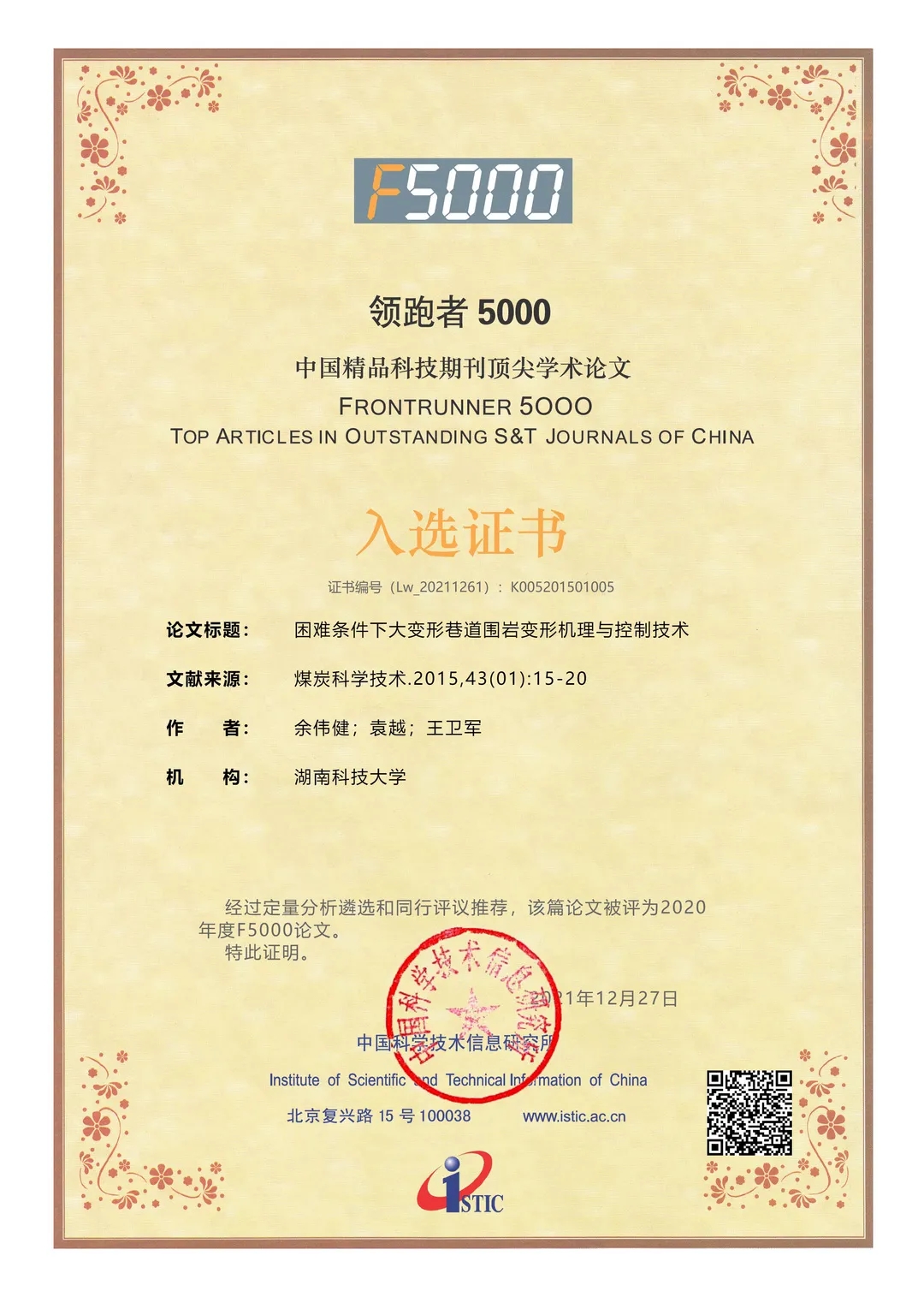 近日,中国科学技术信息研究所发布了2020年度“领跑者5000-中国精品科技期刊顶尖学术论文的评选结果,糖心视频余伟健教授、袁越副教授、王卫军教授在2015年第1期《煤炭科学技术》发表的论文《困难条件下大变形巷道围岩变形机理与控制技术》入选2021年“领跑者5000-中国精品科技期刊顶尖学术论文(F5000)"。